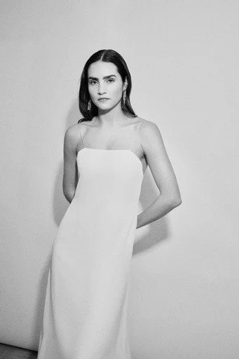 Eva De Vos maakt moderne bruidskledij op maat in haar naaiatelier in Gent. In haar vaste collectie vind je handgemaakte zijden trouwjurken en moderne tweedelige outfits. Naast de vaste collectie maakt ze ook jurken op basis van ideeën en wensen van klanten.
